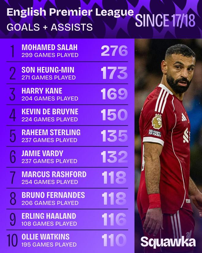 北京时间11月19日,知名数据平台Squawka统计了自2017/18赛季以来,在英超联赛中参与进球数最多的球员榜单,萨拉赫299场276球居首,孙兴慜271场173球位居第二。